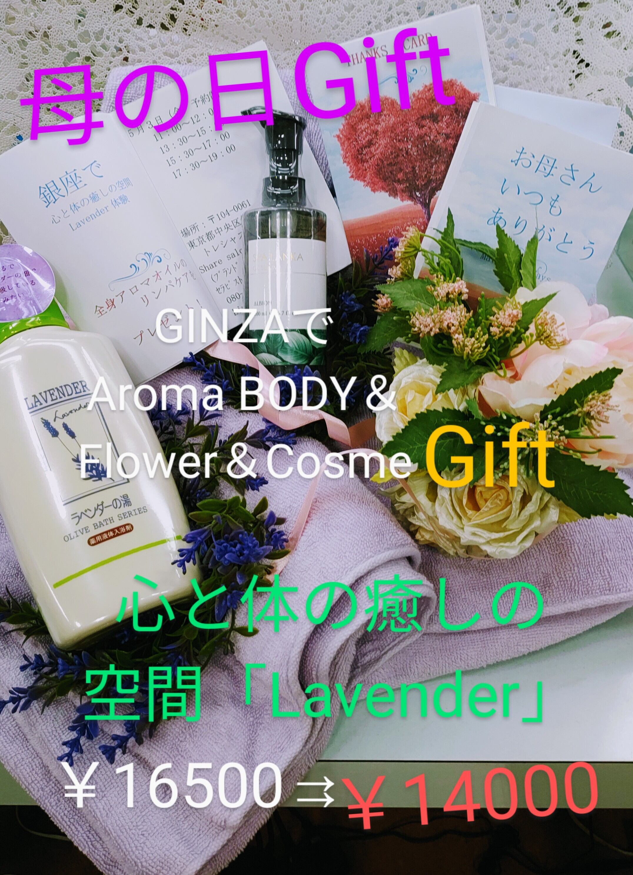 銀座のサロンで全身の疲れを流して、プレゼントの花束やボデイオイルセラムもついてお値段もお得なので、お母様やご家族、彼女さんにプレゼントはいかがですか。